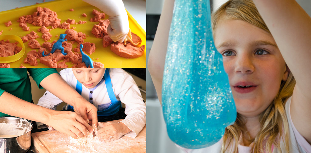 Play with sand, or make kinetic sand (without sand)- Kinetic sand is super simple to make or buy, and is easy to cleanup. Making the kinetic sand together is one activity, and playing with it is another. You can put a variety of things in the sand, such as cookie cutters, sand or playdough molds, plastic utensils, toy cars, buttons, figurines, or anything solid. Finding the items, you’ve hidden and placing them in a designated bin can be a secondary game.